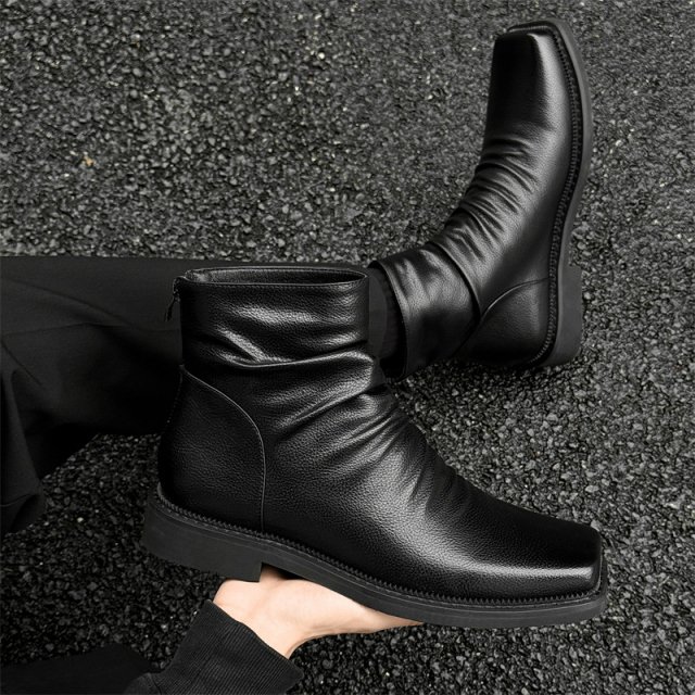 Crafted with split leather upper and PU lining, they offer durability and a soft, comfortable feel. The rubber outsole ensures reliable traction on any surface, while the low heel provides subtle lift without compromising stability. A square toe design adds a bold, masculine touch, making these boots perfect for both casual and semi-formal outfits.