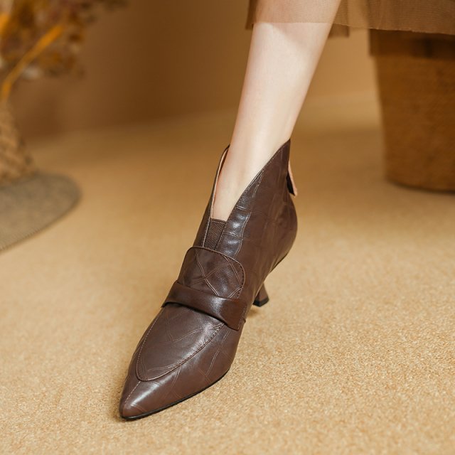 Elevate your wardrobe with these stunning high-heel leather ankle boots, designed to combine fashion, comfort, and durability. These boots are made from genuine cow leather, offering a luxurious feel and a long-lasting fit that molds to your feet over time. The pointed toe adds a touch of elegance, while the chunky heel gives you a confident lift without compromising stability. Whether dressing up for a night out or adding a chic edge to your everyday look, these boots are the ultimate wardrobe essential.
